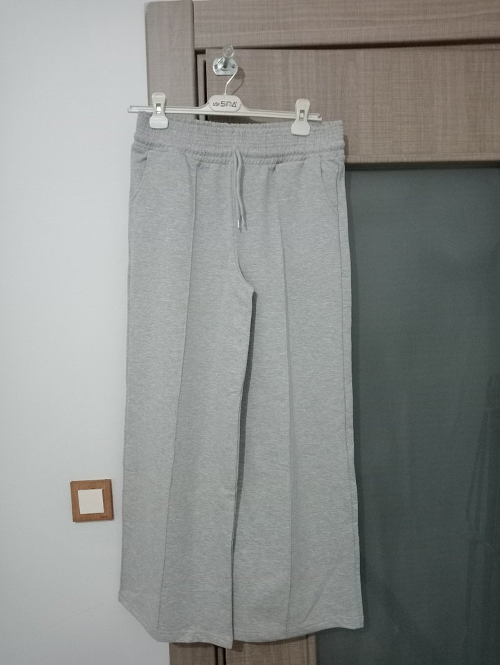 Pamuklu, gri, rahat kesim kadın eşofman, normal midi boyda. Günlük kullanıma uygun, desen içermeyen sade tasarım.