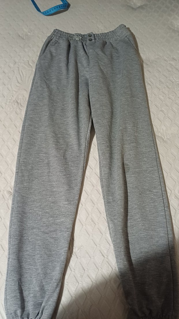 Gri pamuklu eşofman, rahat kesim ve normal boy ile günlük kullanım için zahmetsiz şıklık sunar. Athleisure tarzına uygundur.