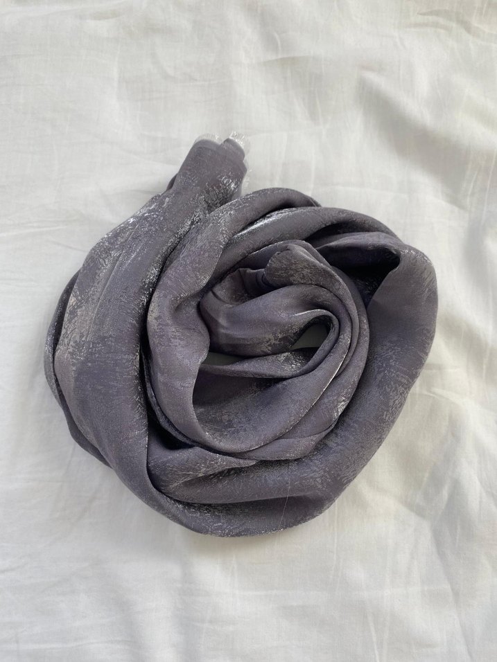 Gri renkte, parlak görünümlü ve drapeli kadın şalı, bohem ve Paris tarzını yansıtır. ️