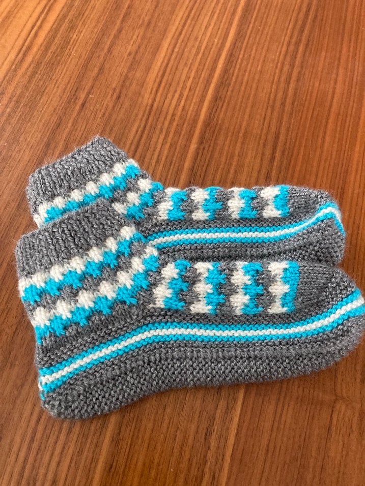 Gri ana renkli, mavi ve beyaz çizgili yumuşak örme kadın çorabı, rahat kullanım sağlar. El örmesidir. İstenilen renk ve desende sipariş alınır.