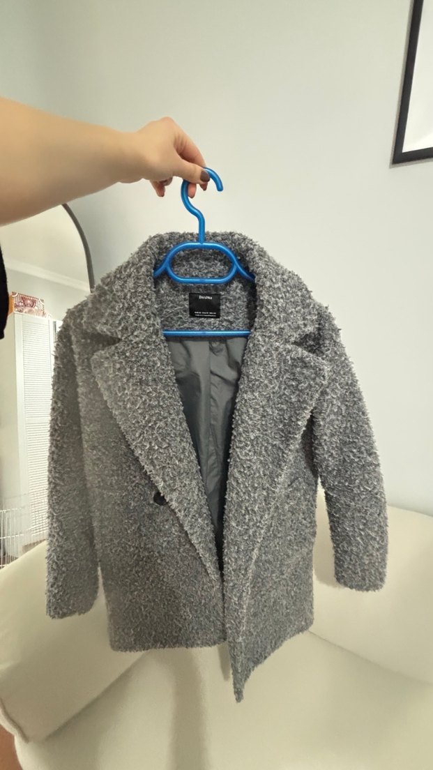 Gri renkli, peluş dokulu, yaka detaylı kadın ceketi, rahat kesimiyle sokak stiline uygun.