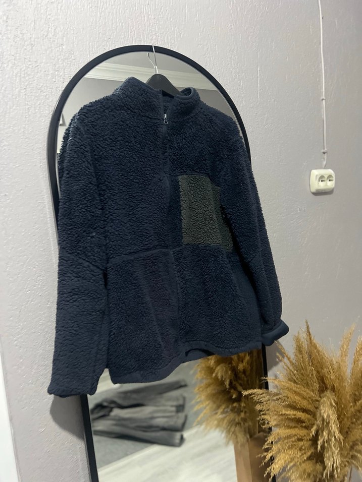 Gri renkte, yüksek yakalı ve uzun kollu kadın ceket. Yumuşak, kürk detaylı kumaştan yapılmış, rahat ve midi boyda, günlük sokak stili için uygundur.