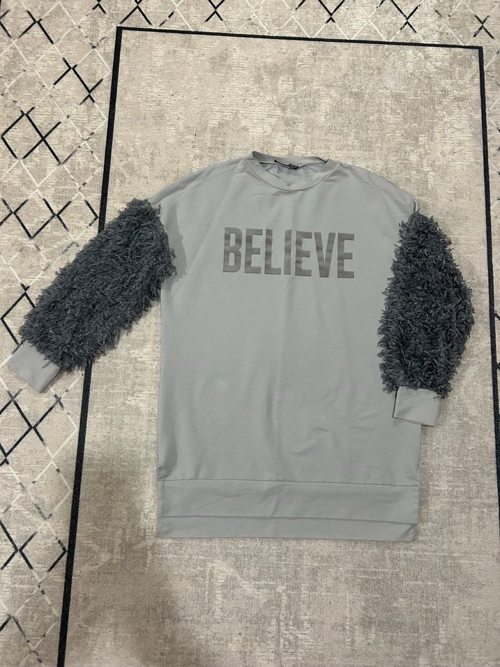 Gri renkli kadın sweatshirt, peluş detaylı uzun kollara ve önünde "BELIEVE" baskısına sahiptir. Yuvarlak yaka ve bol kesimiyle rahat bir sokak stili sunar. Uzunluğu 76 arka uzunluğu 80 cm üründe herhangi bir sorun yoktur