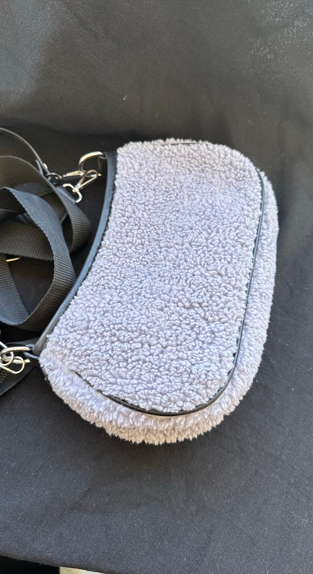 Gri renkli, yumuşak ve sıcak dokulu, kürk detaylı kadın omuz çantası. Ayarlanabilir askısı ile sokak stili için uygun.
