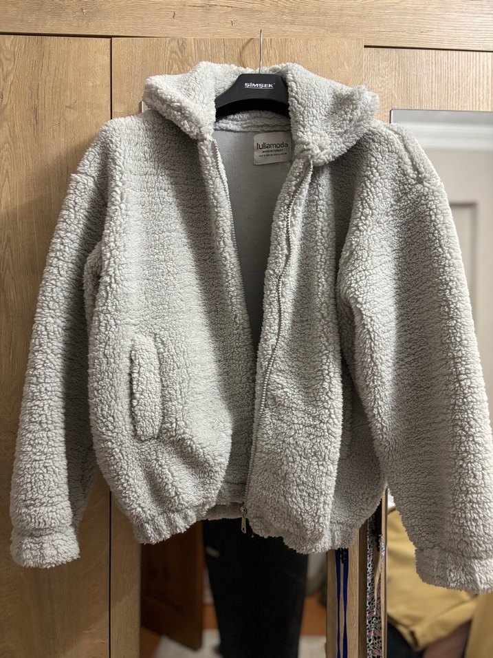 Gri renkte, peluş kumaştan, bol kesim ve yakası kesik detaylı kadın ceketi. Uzun kollu ve midi boyda, rahat sokak stili için uygundur. Herhangi bir defosu yok.