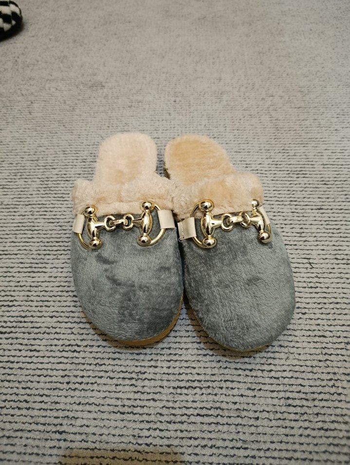 Kadınlar için peluş malzemeden yapılmış, tokalı ve nakış detaylı gri terlikler. Dolgu topuklu ve günlük kullanım için rahat ve sıcak tutar.