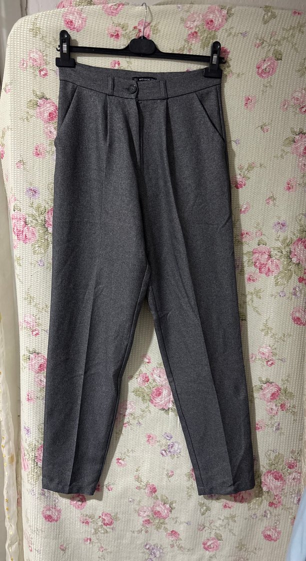 Gri renk, pilili, midi boy, rahat kesim kadın kumaş pantolon. Günlük kullanıma uygun, yumuşak sentetik kumaştan.