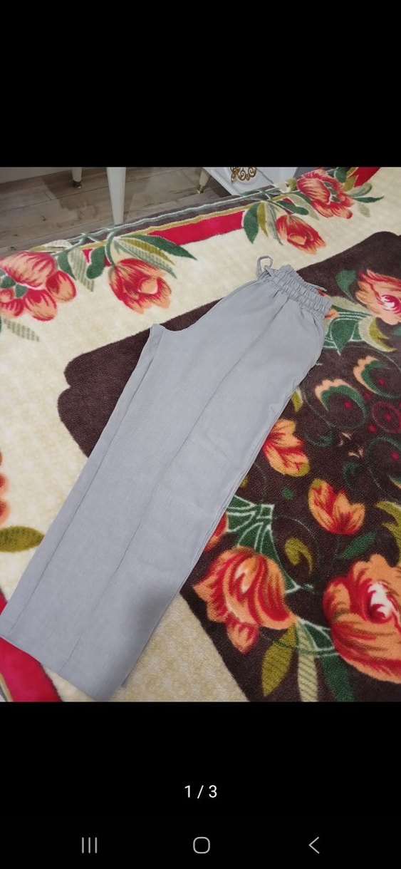 Gri renkte, piliseli detaylı, uzun ve regular fit kesime sahip, yumuşak sentetik kumaştan yapılmış kadın pantolonu. 38 beden ama ben 46 beden kullnadm beli lastkli