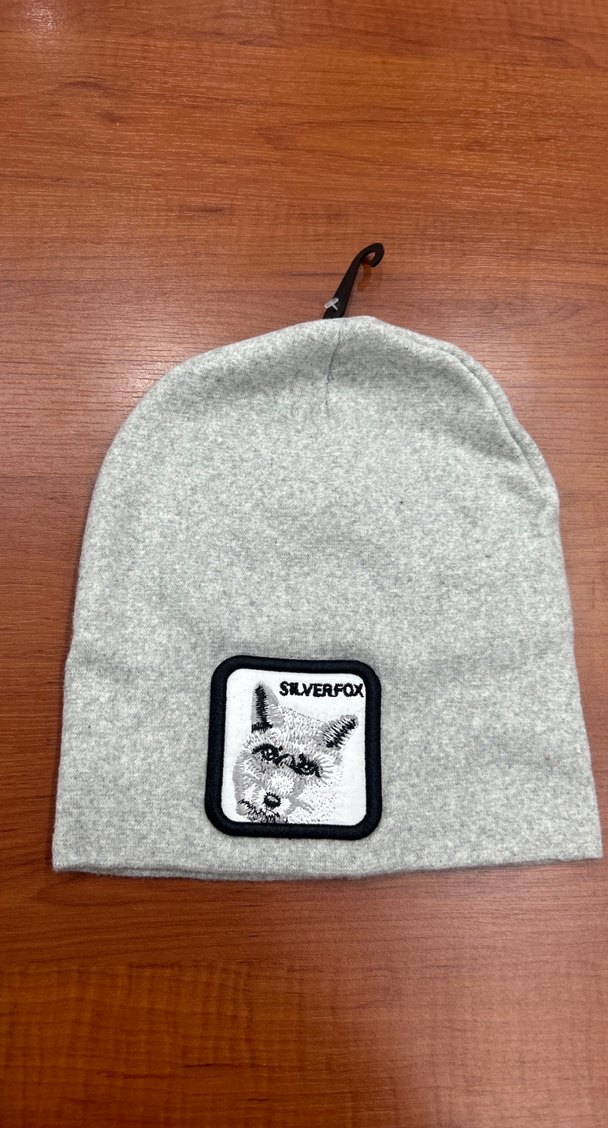 Yumuşak ve sıcak polar kumaştan gri kadın bere, Velcro detaylı gümüş tilki desenli yama içerir. Trendy ve rahat sokak tarzına uygundur.