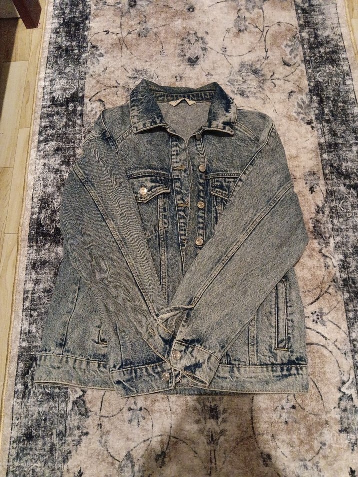 Gri renkte, düğmeli, uzun kollu, rahat kesim ve normal boyda kadın denim ceket. Notch yaka detayı ve sokak stiline uygun tasarım içerir.