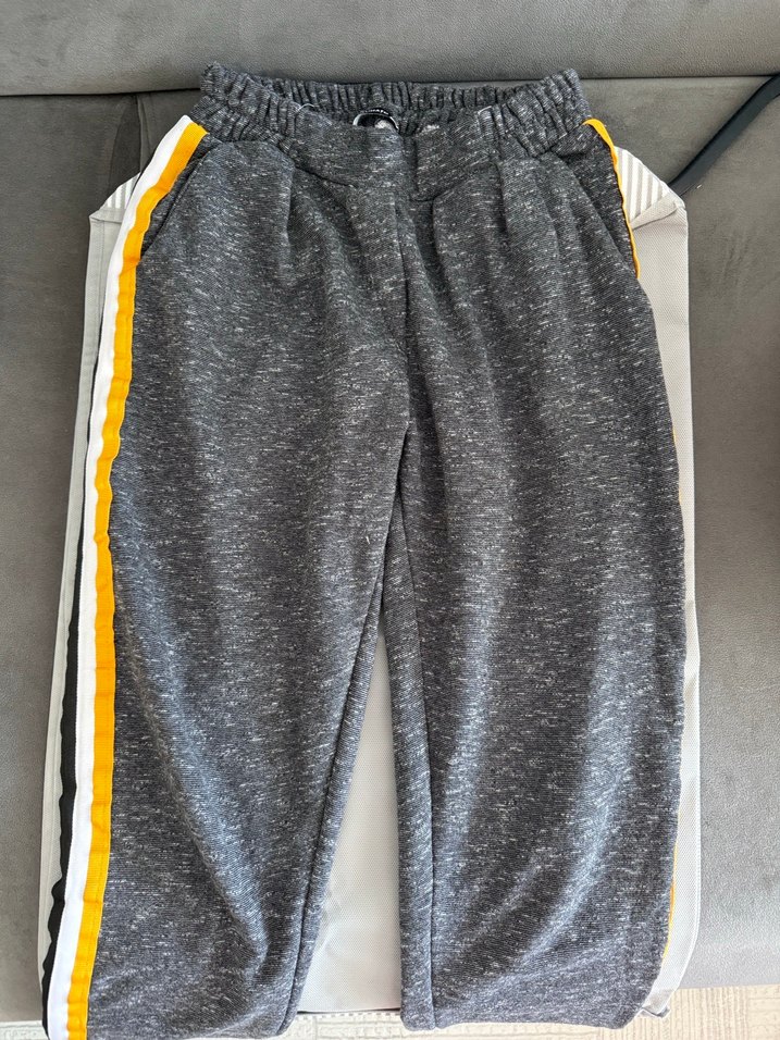 Gri renkte, bol kesim ve lastikli bel detaylı. Sarı ve beyaz yan şeritleriyle sokak stili sunar. ️