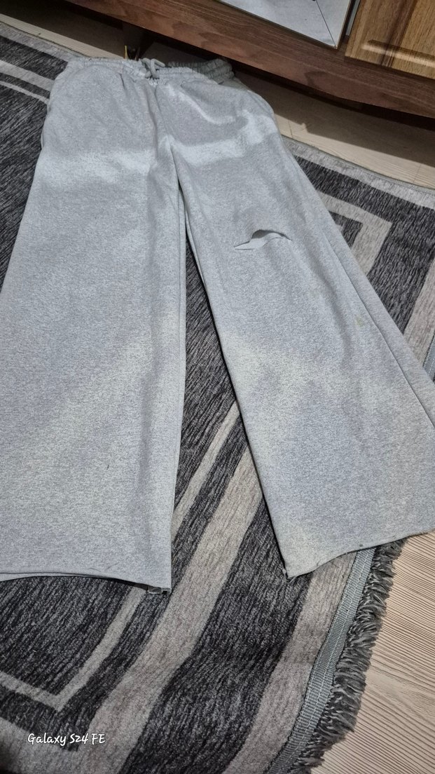 Gri renkte, rahat. bacağında yırtmaç detayı vardır, gündelik kullanıma uygundur. m l uyumlu