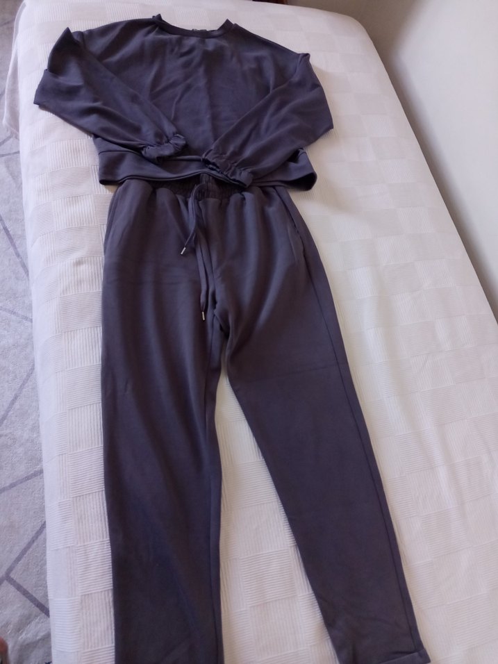 Gri renkte, rahat kesim kadın eşofman takımı. Yuvarlak yakalı ve askılı kollu, yumuşak sentetik kumaştan üretilmiştir. Günlük kullanım için uygundur. ♀️