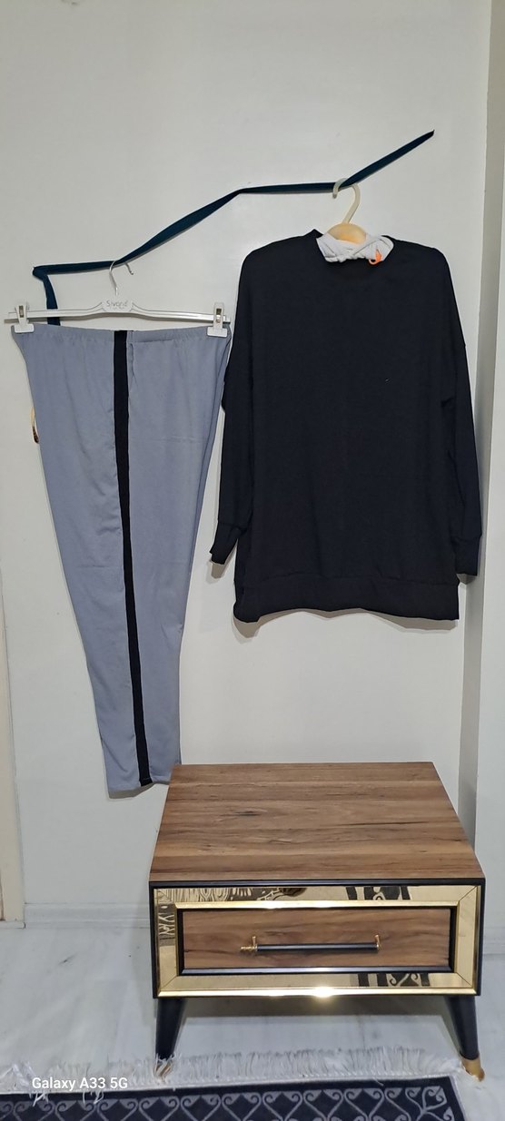 Kadınlar için gri renkte, uzun kollu, yuvarlak yakalı ve rahat kesim eşofman takımı. Yumuşak ve sıcak kumaştan üretilmiş, günlük kullanım için şık ve rahat.