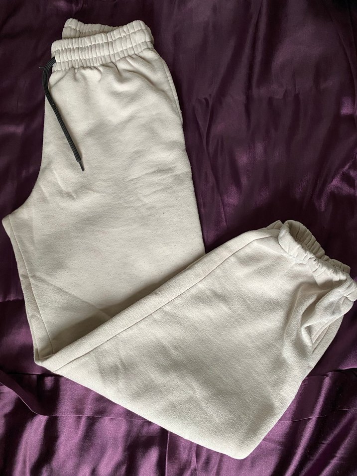 Bu kadın eşofman altı, rahat kesim vyumuşak ve konforlu kumaştan yapılmıştır. Düz krem renkte, elastik bel ve bağcık detayına sahiptir, günlük sokak stili için uygundur. uzun geldği için satıyorum, çok rahatt