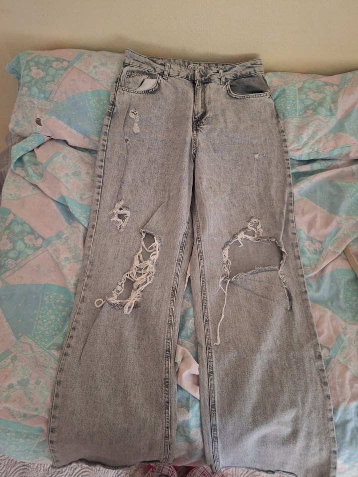 Gri renkte, rahat kesim ve midi boy kadın jean. Tokalı detay ve yırtık tasarıma sahip, günlük sokak stili için uygun.