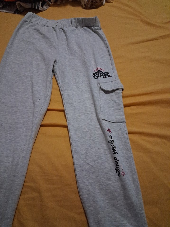 Gri renk, rahat kesim, yanında baskılı desenler bulunan kadın sweatpants. Yumuşak ve sıcak kumaştan yapılmıştır. sıfır kullnılmamıs kargo esofman 12. 13 14 yas olur