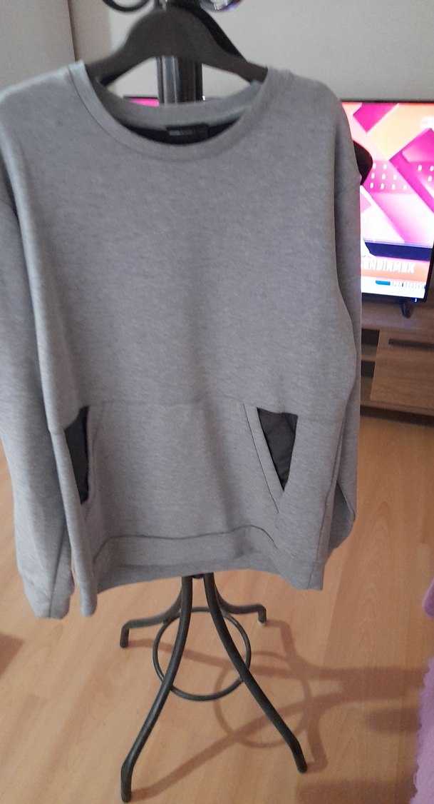 Gri, yuvarlak yaka, uzun kollu, rahat kesim sweatshirt. Yumuşak ve sıcak kumaştan üretilmiş, iki ön cepli, günlük kullanım için uygun.
