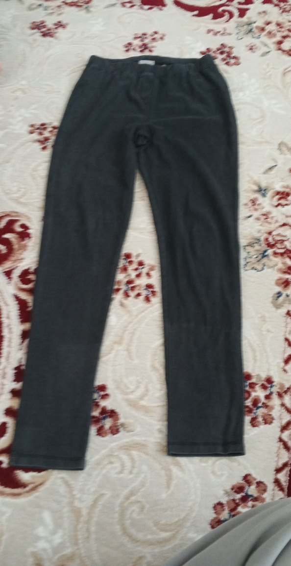 Gri, elastik bel bandına sahip, yumuşak sentetik kumaştan yapılmış rahat kesim kadın taytı. Günlük sokak giyimi için uygundur.