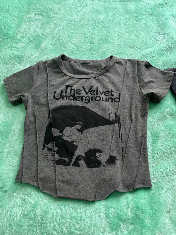 Gri süet kumaştan, kısa kollu, yuvarlak yakalı ve bol kesim hamile tişörtü. Rock punk tarzı baskılı, dış mekan kullanımı için uygun.