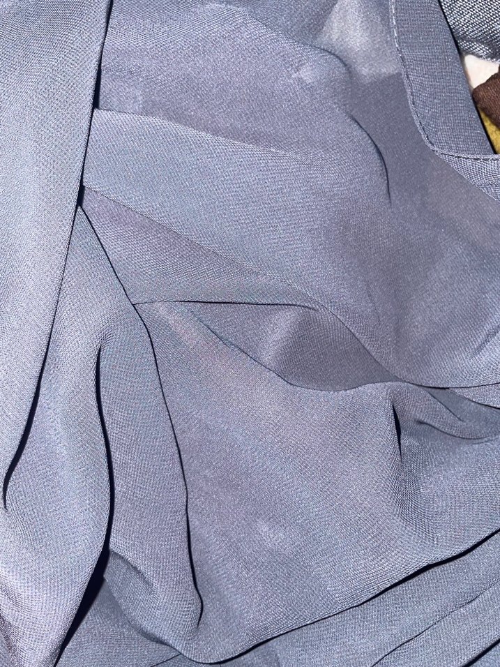 Sentetik kumaştan yapılmış, gri renkli, drapeli kadın şalı, minimal bohem tarzına uygundur.