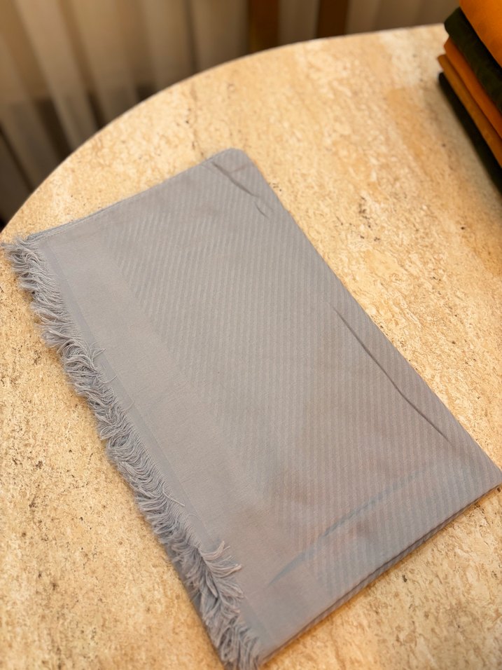 Yumuşak sentetik kumaştan gri kadın şalı, pileli kenarları ve rahat, sade tarzıyla günlük kullanıma uygundur.