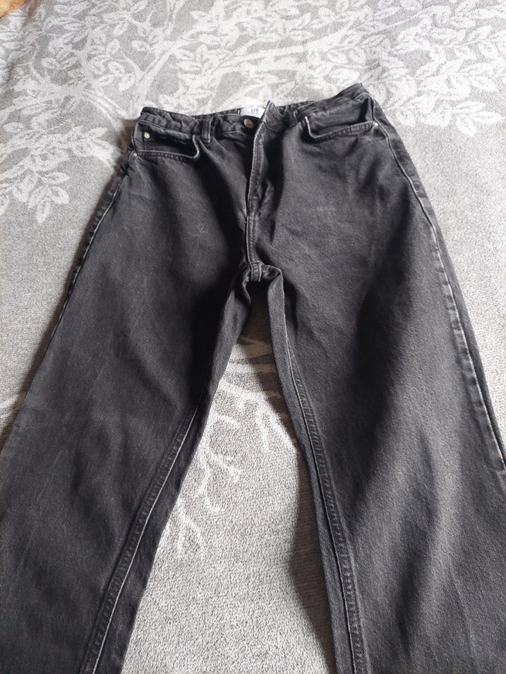 Gri renkte, salaş kesim ve normal midi boyda denim pantolon. Günlük rahat sokak stiline uygun, desensiz ve şık görünümlü.