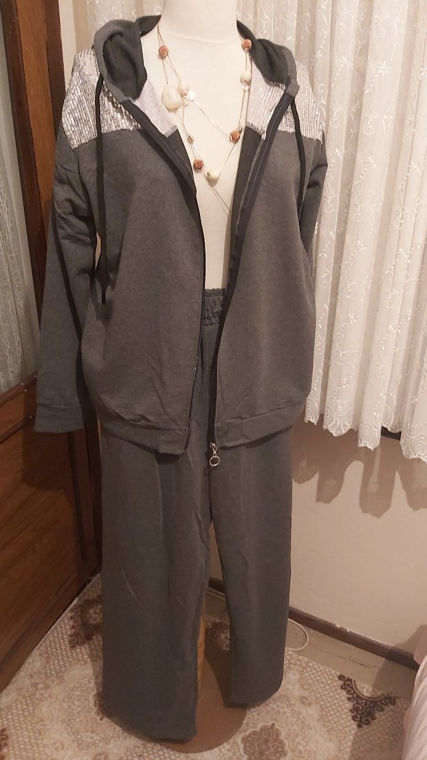 Gri renkte, bol kesim, kemerli ve uzun kollu kadın eşofman takımı. Notlu yakası ve fermuarlı önüyle rahat ve şık bir sokak stili sunar. ️üstte ve yandaki şeritler pul payetli hafif transparandir.