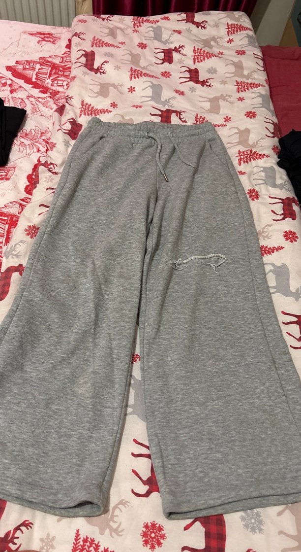 Yumuşak pamuklu kumaştan, salaş kesim gri eşofman. Belde bağcıklı ve yanlarda yırtmaç detaylı, günlük rahat kullanım için uygun.