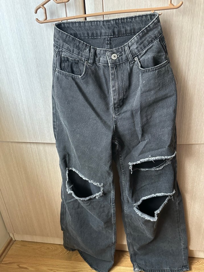 Gri renkte, salaş kesim ve normal boyda denim kot pantolon. Diz kısmında yırtık detayları ve kemer tokası bulunur. Günlük ve sokak stili için uygundur.