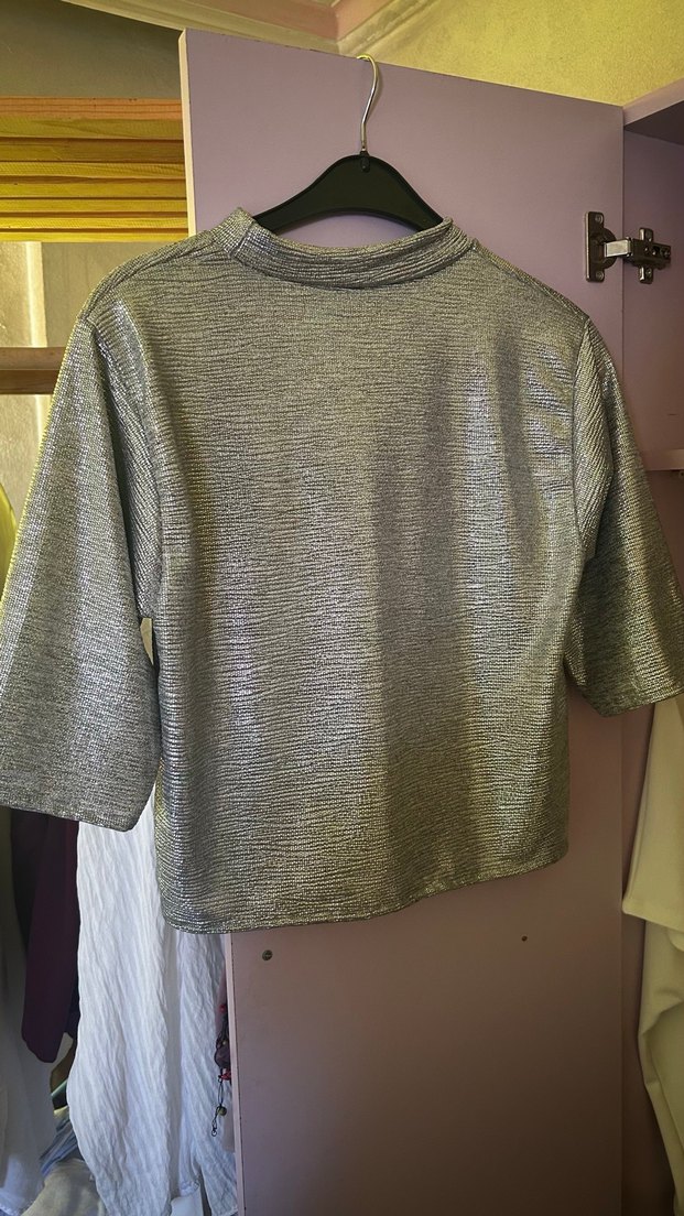 Gri sentetik kumaştan, salaş kesim, kısa kollu, bisiklet yaka kadın bluz. Düğmeli detaylı, midi boyda, günlük sokak stiline uygun.