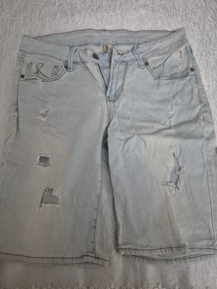 Gri salaş kesim mini denim şort, hafif yırtık detaylarıyla sokak tarzı sunar, günlük kullanım için uygundur.