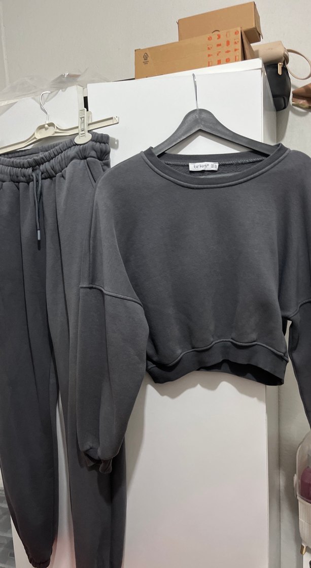 Gri renkte, salaş kesim, uzun kollu ve yuvarlak yaka kısa sweatshirt ile eşofman altından oluşan rahat ve şık kadın eşofman takımı. Günlük kullanıma uygun.