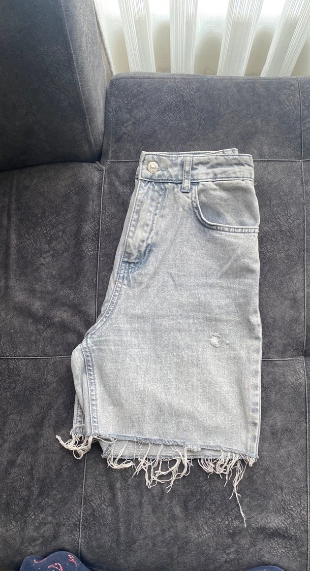Gri renkte, salaş kesim kadın kot şort, kısa boy ve salaş kenar detaylarıyla rahat ve şık bir görünüm sunar.