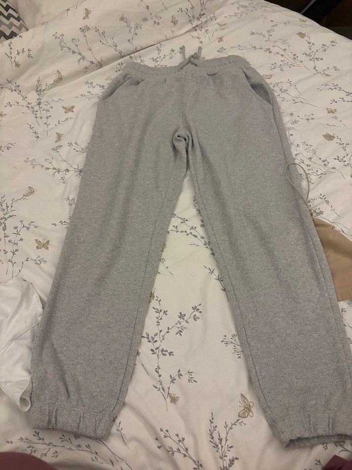 Pamuklu, gri renkte, salaş kesim ve midi boyda kadın eşofman altı. Günlük kullanıma uygun, rahat ve şık görünümlü.