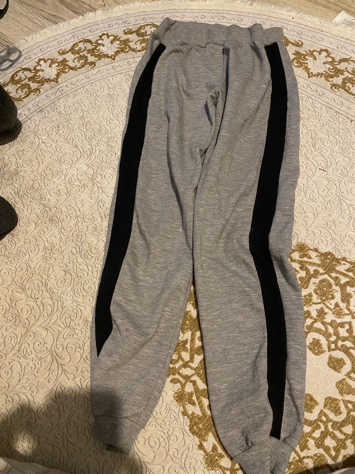 Gri renkte, siyah yan şeritli, salaş kesim kadın spor eşofman altı. Yumuşak sentetik kumaştan, günlük rahat kullanım için uygun. ♀️