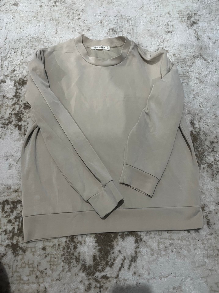 Bej renkli, uzun kollu, yuvarlak yakalı ve salaş kesime sahip kadın sweatshirtü, yumuşak kumaştan üretilmiştir.arkasının dikildiği yerde hafif esneme vardır