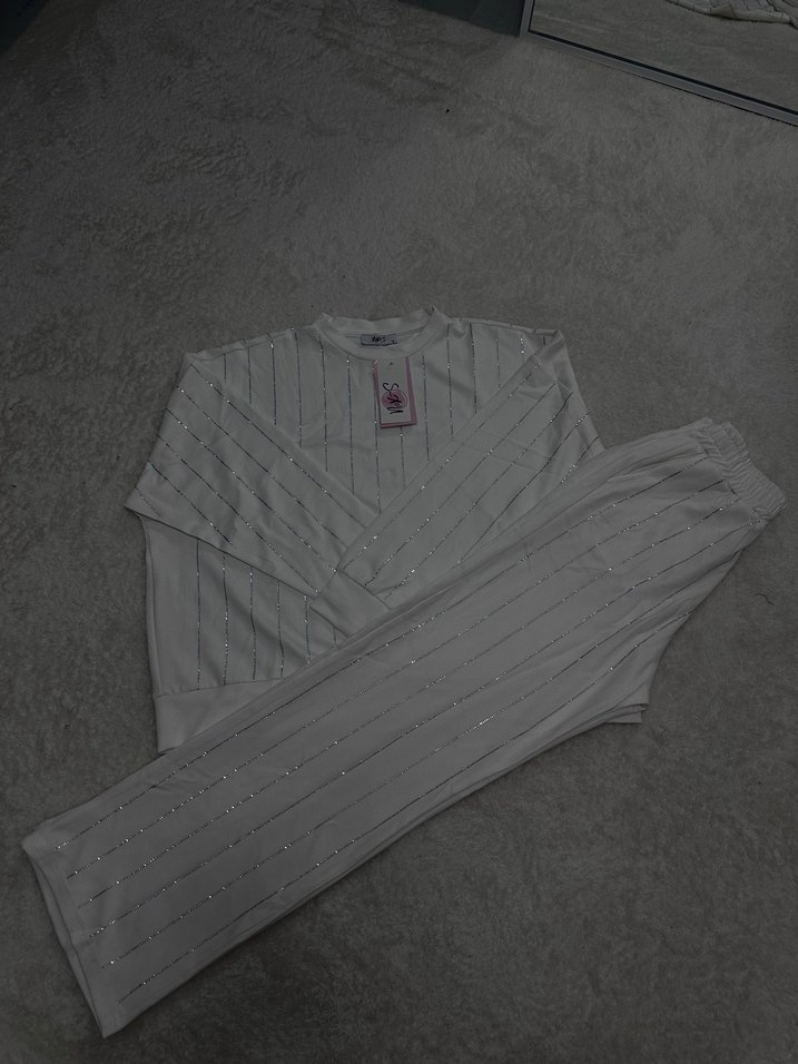 Gri renkli, uzun kollu, salaş kesim kadın eşofman takımı. Yumuşak sentetik kumaştan, ince çizgili detaylarla günlük rahat stil için uygun.