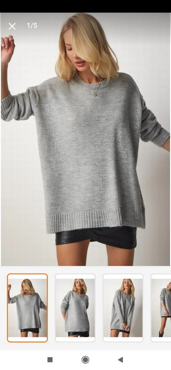 Gri renk, uzun kollu, yuvarlak yakalı kadın triko kazak. Salaş kesimi ve yumuşak örgü kumaşıyla rahat ve şık bir görünüm sunar.