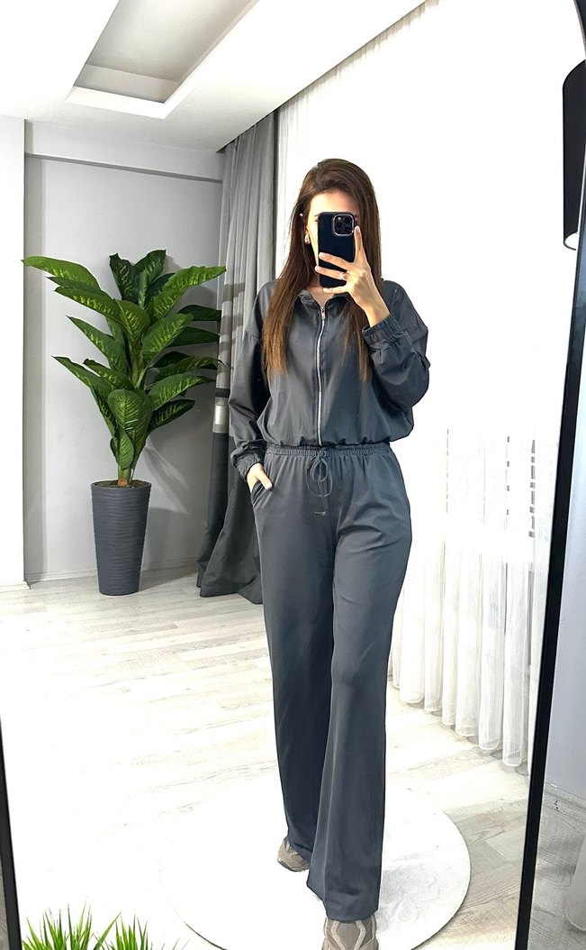 Gri renkte, uzun kollu ve bisiklet yaka, salaş kesim kadın eşofman takımı. İpeksi kumaştan, rahat ve şık günlük stil için uygundur.