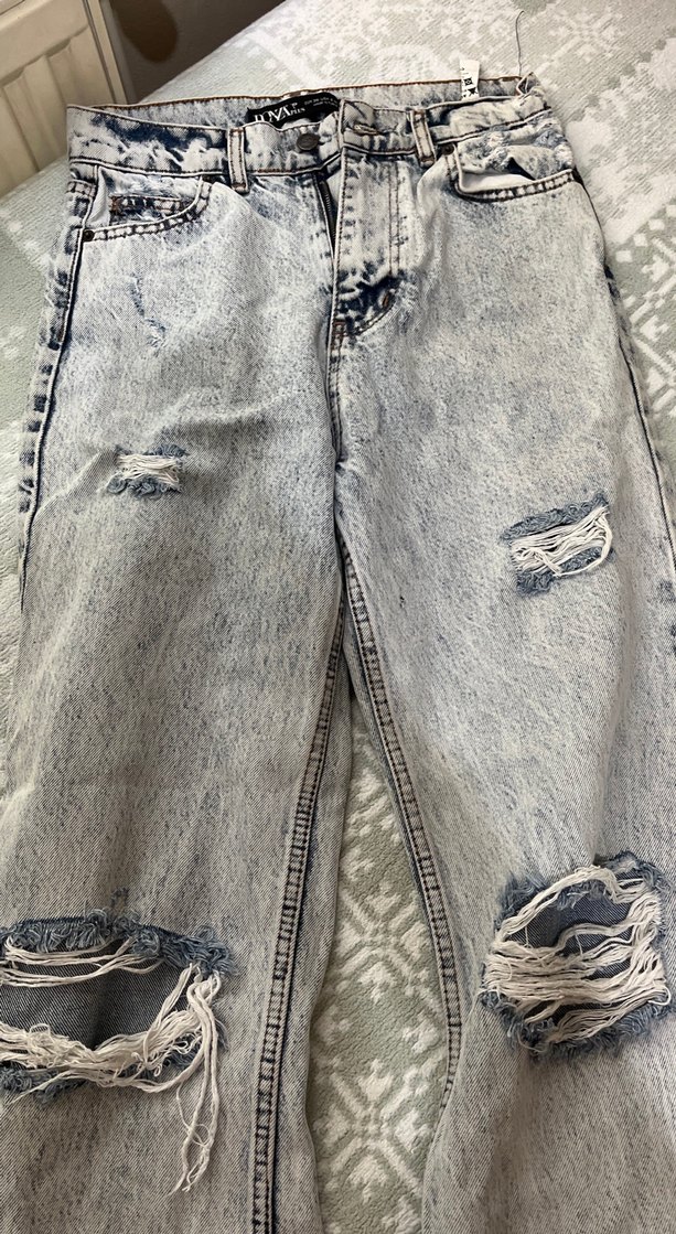 Gri denimden yapılmış, salaş kesimli ve yırtık detaylı, midi boy kadın pantolon. Sokak stiline uygun, tokalı ayrıntılar içerir. Günlük kullanım için uygundur.