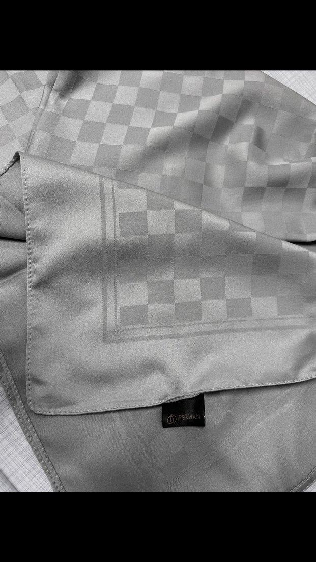 Gri renkli kadın sarmal şal, zarif kare desenli detaylıdır. Pürüzsüz sentetik kumaştan üretilmiş, minimalist tarz için uygundur.