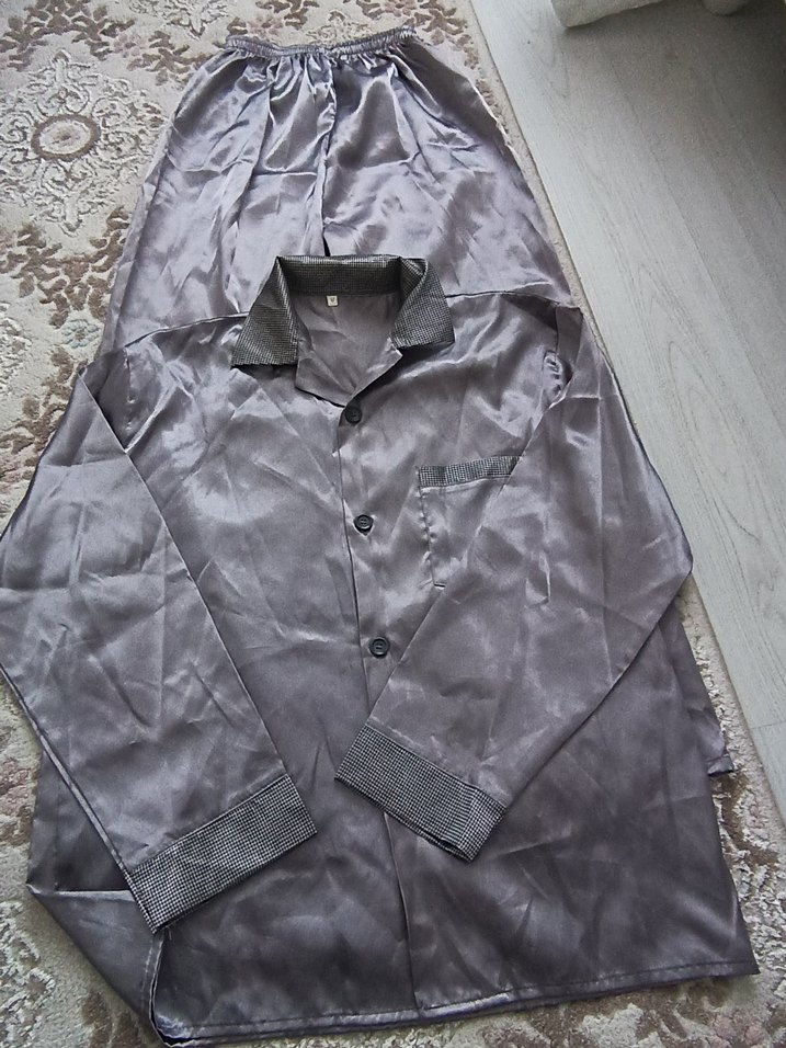 Kadınlar için gri renkte, parlak ve yumuşak saten kumaştan yapılmış, uzun kollu ve midi boyda, rahat kesim pijama takımı.