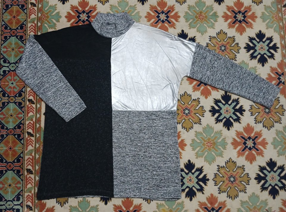 Uzun kollu, balıkçı yaka, örgü dokulu bu kadın kazak, gri tonlarda, günlük kullanıma da uygun aynı zamanda şık rahat kesimlidir. Farklı desenli ön üst siyah kısmı iç gösteriyor. Hiç bir kusuru yoktur. Gönül rahatlığıyla kullanabilirsiniz.