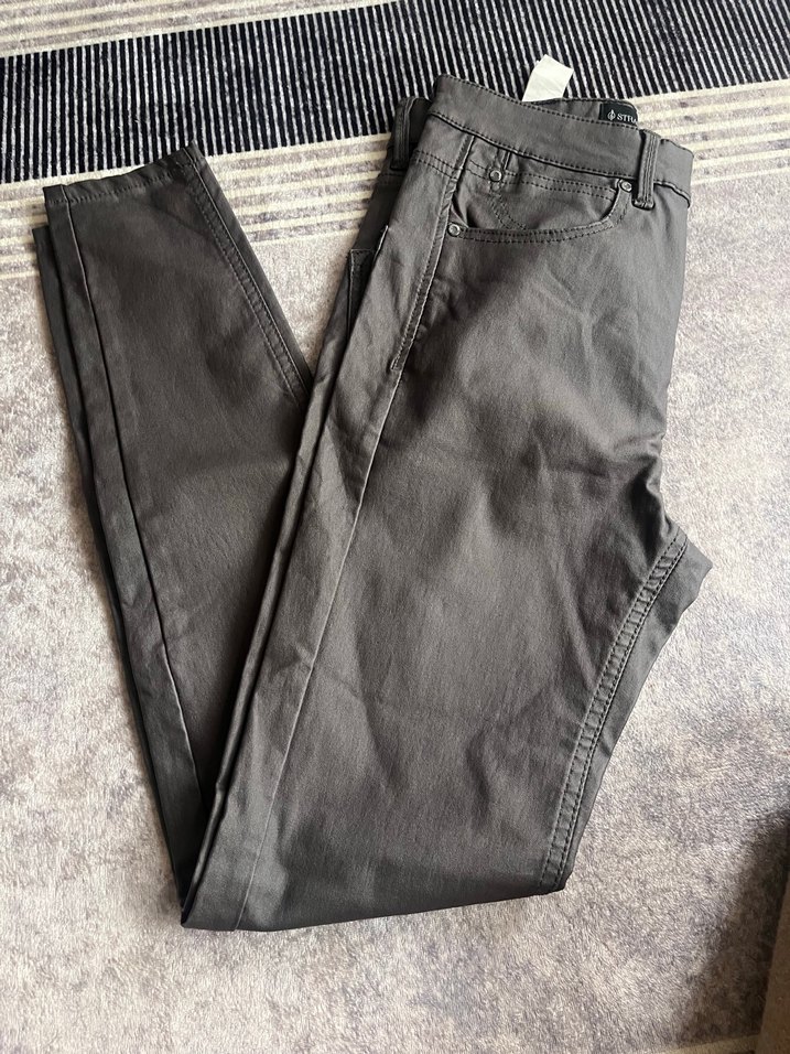 Gri renkli, regular fit kesim skinny denim pantolon. Normal boyda, kemerli ve desensiz tasarıma sahip, günlük kullanıma uygun.
