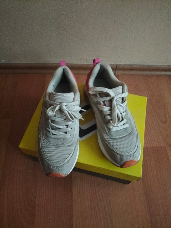 Gri renkte, kauçuk tabanlı ve cırt cırtlı detaylı kadın spor ayakkabısı. İnce topuklu ve sokak stiline uygun.temizdir orijinaldir
