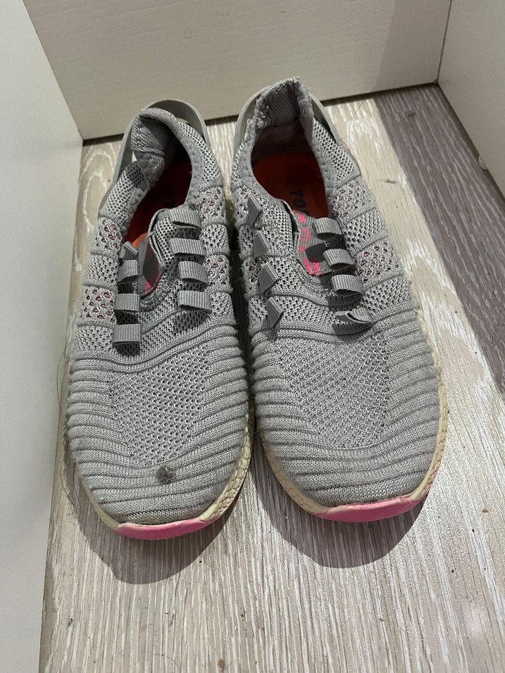 Gri renkte, dolgulu topuklu ve bağcıklı tasarıma sahip kadın spor ayakkabısı. Kauçuk tabanlı, spor ve sokak giyimine uygun.
