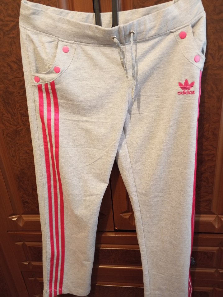 Gri sentetik kumaştan, midi boy, bol kesim kadın spor eşofman altı, düğmeli ve pembe baskılı çizgilerle detaylandırılmış.