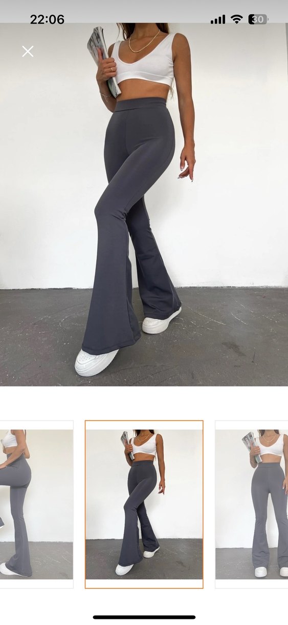 Gri, fitted kesim, midi boy spor ispanyol paça pantolon, yumuşak sentetik kumaştan, rahat ve şık görünüm sunar. Hiç giyilmedi .