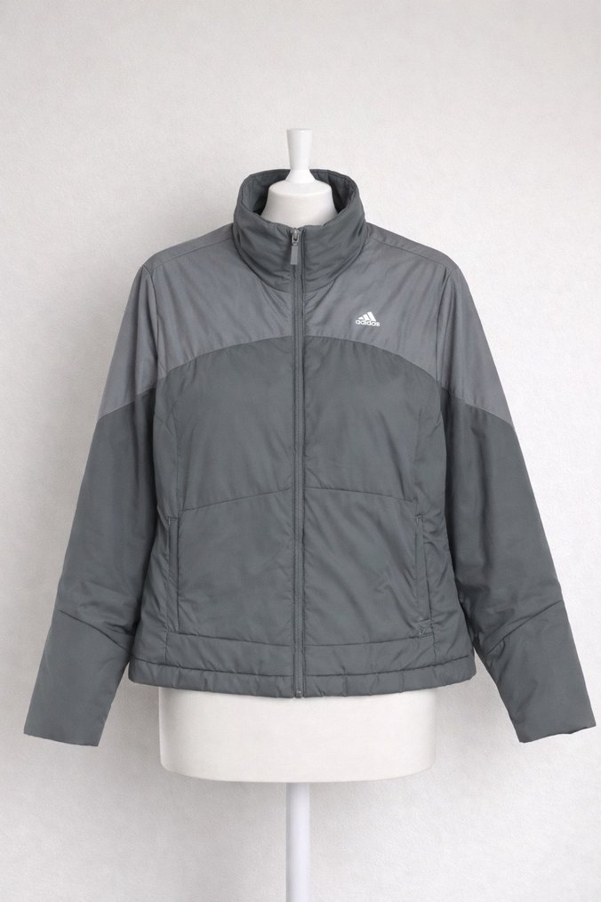 Fermuarlı, yüksek yakalı ve uzun kollu, gri renkli, kalıplı kadın kış ceketi, yumuşak ve sıcak kumaştan outdoor için uygundur.